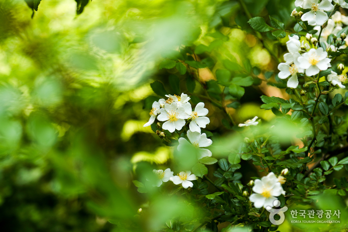 전망대에서 데크를 따라 내려오면 본격적인 용암길 시작점이 나타난다. 입구에 호기심 많은 여행자를 환영하듯 찔레꽃이 활짝 피었다. 햇살이 내리쬐는데도 얼마 걷지 않아 축축한 습기가 느껴지고, 사방에 고사리와 이끼가 보인다. 다른 숲에서 맛보지 못한 원시의 기운이 다가온다.