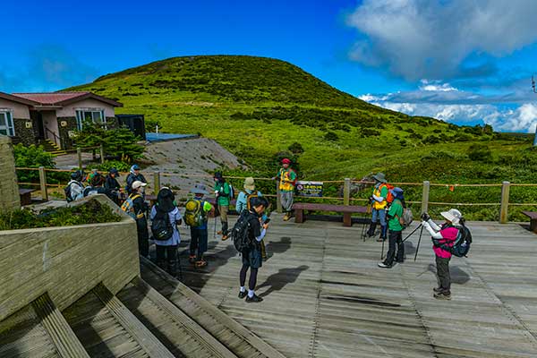 윗세오름대피소에 모인 모세왓 공개투어 참가자들. 출발에 앞서 주의 사항을 전달하고 있다.