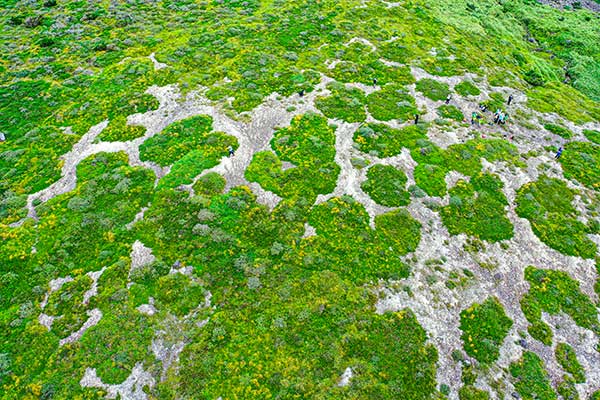 그렇게 거칠고 험한 수풀을 헤치며 1시간쯤 간 곳에서 드디어 모세왓을 만났다. 한라산 백록담 남서쪽의 해발 1,300~1,500m 고지대에 형성된 평탄지. 드넓게 펼쳐진 푸른 수풀 사이로 회백색의 거대한 자갈밭이 듬성듬성 섞여 나타난다. 한라산 정상인 백록담 굼부리가 생겨나기 전인 2만8,000년 전쯤, 작은 용암돔이 무너지면서 발생한 화산쇄설류가 널브러져 만들어졌다. 긴긴 세월 비바람에 깎여나간 밝은 빛의 돌조각들은 최대 600m 폭으로 2.3km나 이어진다. 그 면적이 마라도보다 더 넓다고 한다.