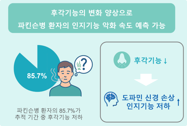 연구팀은 “후각 기능 변화 양상이 파킨슨병 환자의 인지 저하 속도를 예측하는 핵심 지표가 될 수 있다”며 “비침습적이고 간단한 후각 검사만으로 인지 저하 위험을 조기에 예측할 수 있어 향후 진단과 치료 계획 수립에 도움이 될 것”이라고 설명했다.