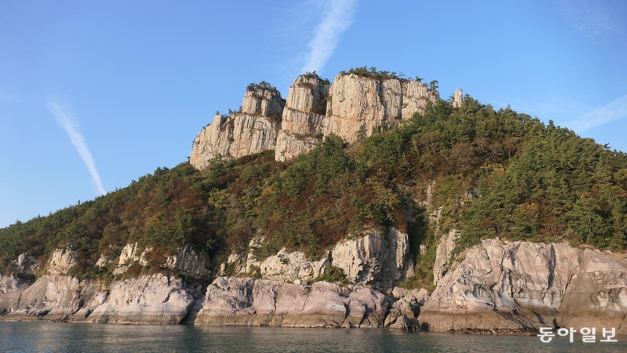 암벽은 회백색과 베이지색이 섞인 빛깔을 띤다. 카메라를 줌인해서 들여다보니 단순한 바위가 아니다. 주상절리다. 제주도 중문 해안에서 보는 주상절리처럼 검은색을 띠지는 않는다. 현무암이 아니라 화산재 같은 화산 분출 물질이 퇴적해 생긴 응회암이어서다.